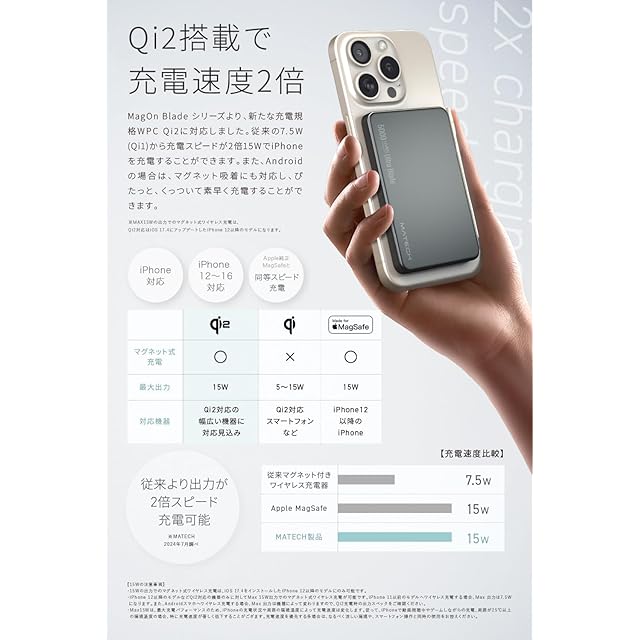 【Qi2搭載で充電速度2倍】MagOn Blade シリーズより、新たな充電規格WPC Qi2に対応しました。従来の7.5W(Qi1)から充電スピードが2倍15WでiPhoneを充電することができます。また、Androidの場合は、マグネット吸着にも対応し、ぴたっと、くっついて素早く充電することができます。