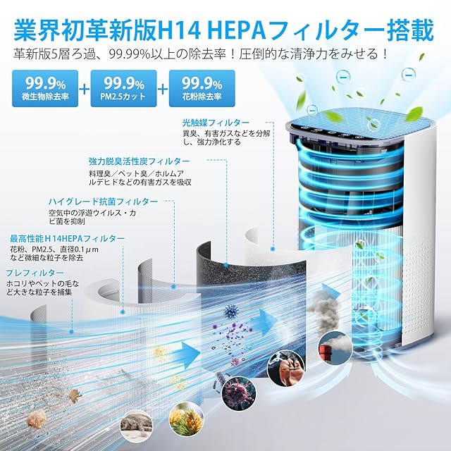商品名:空気清浄機 小型【令和7年新登場・業界初H14フィルター・革新版5重ろ過・圧倒的な清浄力】12畳 極静音 空気清浄機 ペット 花粉 卓上 軽量 省エネ 高性能 HEPAフィルター 集じん 脱臭強化 除菌 ハウスダスト/花粉対策/ほこり/ペット/PM2.5/ウイルス除去/カビ/消臭/アレルギー対策 3段階風量 タイマー機能 チャイルドロック ナイトライト 節電対策 PSE&METI認定済み