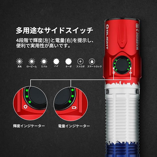 商品仕様 : 最大出力:2300ルーメン 最大射程:300m 最大ランタイム:55日間 色温度:6500K 重さ:255g(電池含め) 電源:充電池 防水レベル:IPX8 落下試験:1.5m 特徴 : 高性能なLEDを搭載し、2300ルーメンまでの高輝度を備え、500メートルのホワイトビームを 出力します。防災、作業、旅行など幅広く対応できま す。専用の大容量バッテリ―を搭載し、200ルーメンの場合、最長13時間の連続使用 が可能です。充電ケーブルが付属しており、最大2Aの充電電流に対応できます。インジケ ーターランプも付き、赤(充電中)と緑(充電済み)を点灯して提示します。サイドスイッチに電量(右)と輝度 (左)のインジケーターが付き、それぞれ4段階を持ち、使い場所やニーズに合わせて輝度を好き勝手に設定で きます。 また、Warrior 3SはIPX8の防水レベルに達し、水面下2メートルにおいても壊れず、丈夫で、衝撃に強く、キャンプ、釣り、登山などのアウトドア活動に適用します。記憶センサーが内蔵され、メモリー機能が付いて おります。OFFしてから再び点灯すれば元の点灯モードに戻ります。 また、ターボ、ストロボ、ハイビーム、ロービー ム、通常点灯、月光などを含めて7種類の点灯モードを備え、様々な使用環境に応じて自由に変更できます 。誤作動防止するキーロックモードが付いており、省エネながら誤作動よるバッグの中に点灯されて過熱の危険から身の安全や貴重品をも守ってくれます。サイドスイッチとテールスイッチで操作可能で、片手で輝度変更や 間欠点灯を切り替えることができ、利便性が高いです