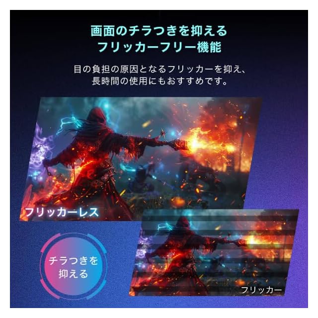 【フリッカーフリー&ノングレア仕様】LEDバックライトのちらつきを軽減する「フリッカーフリー」機能を搭載し、長時間の使用時の目の負担を抑える設計です。また、非光沢(ノングレア)パネルにより、外光や照明の映り込みを抑え、作業環境の光の影響を受けにくい表示が可能です。ゲームプレイやテレワーク、映像視聴など、さまざまな用途に対応します。