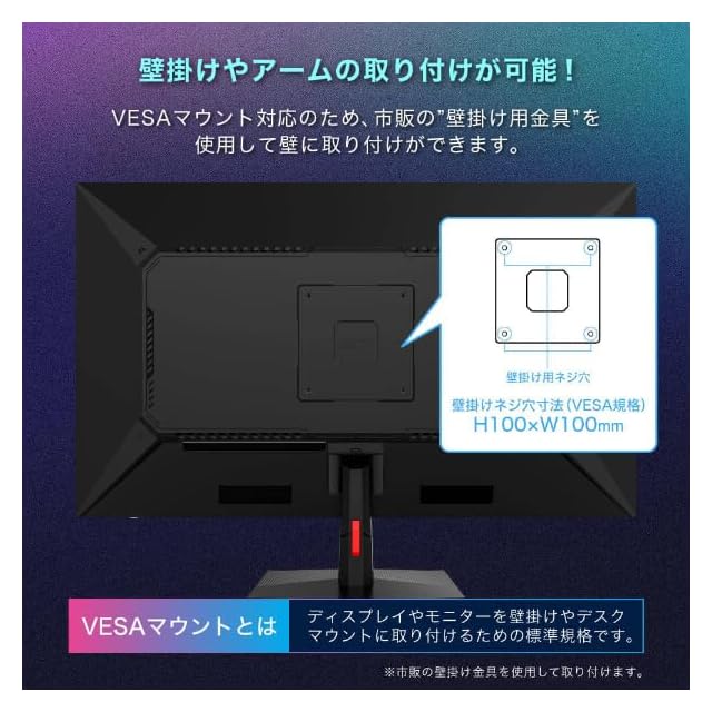 ■ 解像度・表示性能 ・解像度:2560×1440(WQHD) ・リフレッシュレート(最大):180Hz ・応答速度:1ms(GtoG) ・コントラスト比:1000:1 ・輝度:標準300cd/m²/最小250cd/m² ・視野角:左右178°/上下178° ・フリッカーフリー