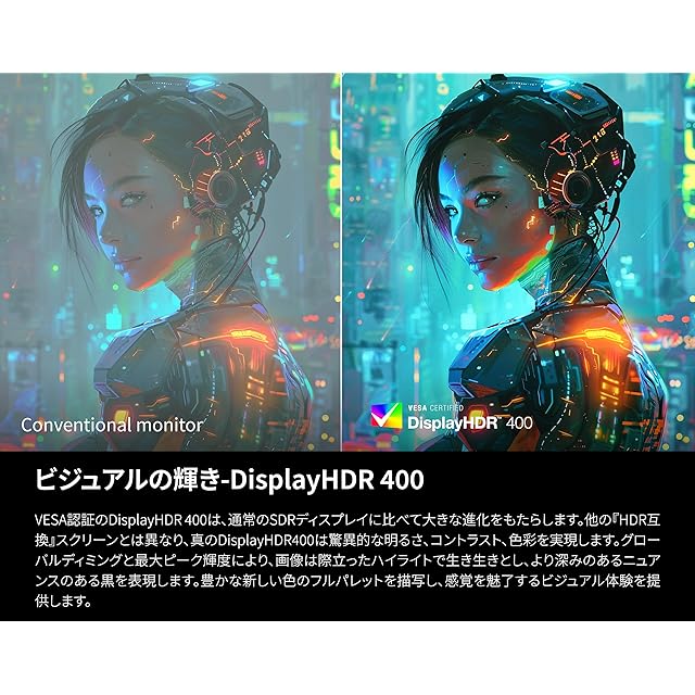【最高リフレッシュレート260Hz&最大応答速度0.3ms】 QHD、2560×1440の解像度を備えた27インチ、高精細IPSパネルを採用。 Adaptive Syncテクノロジーにより、ゴーストやスタッタリング、ティアリングのないスムーズなゲームプレイ体験を提供します。様々なタイプのゲームコンソール(PS5・XBOX・Switch)やゲーミングPCとの接続が可能です。【DisplayHDR 400】VESA認証DisplayHDR 400は、最大400ニットの輝度と高コントラストで、鮮やかで深みのある映像を実現。【ADAPTIVE SYNC】MPRTとAdaptive Syncを組み合わせたMBR Sync技術で、モーションブラーやゴーストを抑制。激しい動きでも滑らかで鮮明な映像を維持します。そして、HDR10を用いて、あらゆる映像をHDRの様な美しい映像に再現することができる為、HDR対応ゲームはもちろん、HDR10方式の映像配信動画の再生にも対応。従来の液晶ディスプレイで再現できなかったリアルな映像体験をお楽しみください。