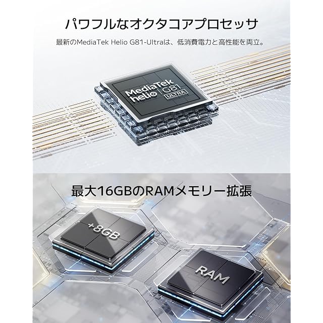 【強力なオクタコアプロセッサ】最新のMediaTek Helio G81-Ultraは、低消費電力と高性能を両立。その卓越した性能により、バッテリーの長持ち、動作のなめらかさ、そして比類のないユーザーエクスペリエンスを実現します。