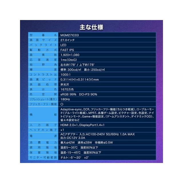 * 画面サイズ: 27.0インチ * バックライト: LED * 駆動方式: FAST IPS * 画素数: 1920×1080 * 応答速度: 1ms(GtoG) * 視野角: 左右約178°/上下約178° * 輝度… ・標準: 300cd/m2 最小250cd/m2 * コントラスト比: 1000:1 * 画素ピッチ: 0.3114(H)×0.3114(V)mm * 表面処理: 非光沢 * 表示色: 1670万色 * 色空間… ・sRGB: 99% ・DCI-P3: 90% * リフレッシュレート(最大): 180Hz * フリッカーフリー機能: ○ * 入力端子: HDMI 2.0×1、DisplayPort1.4×1 * ヘッドホン端子: ×1 * 電源… * ・ACアダプター 入力: AC100-240V 50/60Hz 1.0A MAX * ・出力: DC12V 3.0A * 消費電力: 最大≦42W 通常≦28W 待機時≦0.5W * 使用環境: 温度5~35℃ 湿度80%以下 * 保管環境: 温度-15~45℃ 湿度90%以下 * モニター可動範囲: チルト: -5°~20°±2°