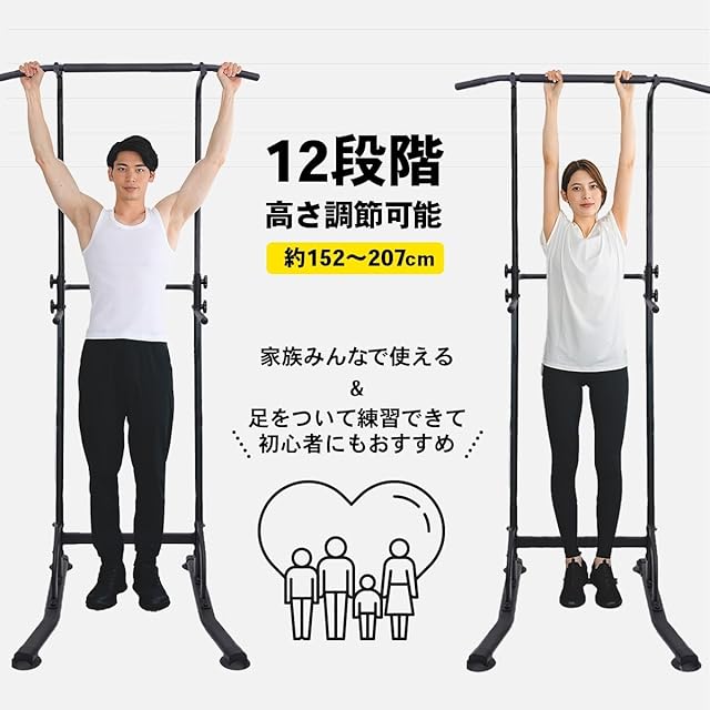 【2024.08 UPDATED / 家族で使える10段階の高さ調整】10段階の高さ調整機能により、ご家族のどなたでもお好みの高さに合わせて自宅でのトレーニングが可能。収納サイズに縮小させると身長約100cmのお子様でも土台に足を置いてぶら下がることができます。ホームジムにも最適な、自宅に一台持っておきたい健康器具です。