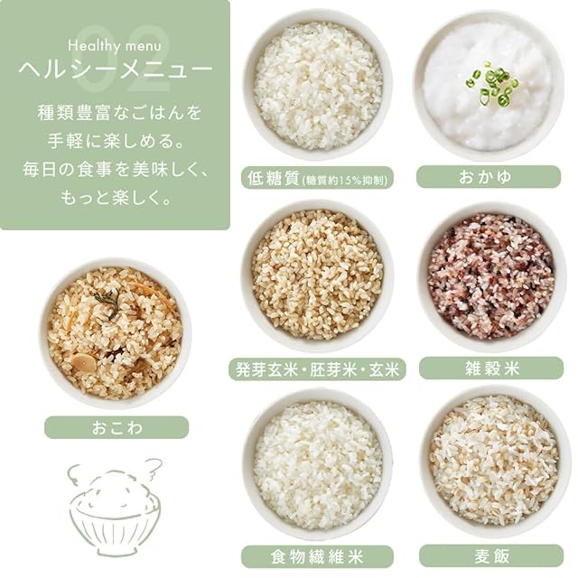 電源:AC 100V(50/60Hz共用)●定格消費電力(炊飯時):485W●炊飯容量(最大):【無洗米・白米・新米・エコ・早炊き・冷凍・おむすび・すし飯・丼・カレー・胚芽米】0.54L(3合)、【炊込み・食物繊維米・おこわ・雑穀米・発芽玄米・玄米・麦飯】0.36L(2合)、【おかゆ:全がゆ/0.18L(1合)、5ぶがゆ/0.09L(0.5合)】低糖質:0.27L(1.5合)