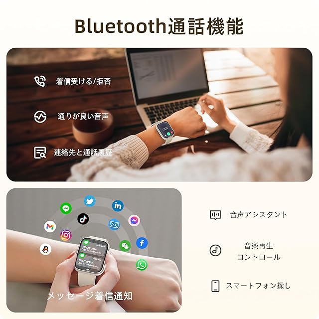 Bluetooth5.3・ハンズフリー通話・AI音声アシスタントとの連携:スマートフォンとペアリングしていれば、スマートウォッチで手軽に直接電話をかけたり、受けたりすることできるため、運転中や手が塞がっているときにスマートフォンを取り出す手間が省けますですから非常に便利です。 Bluetooth機能を使って、スマートウォッチからAI音声アシスタントを呼び出し、音声で操作することもできます。これにより、「誰に電話をかけて」「天気を教えて」「リマインダーを設定して」などの音声コマンドを利用可能です。*右側長ボタンを2秒長押しでAI音声アシスタントを喚起します。