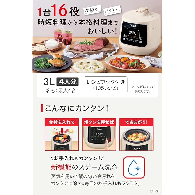 商品名:ティファール 電気圧力鍋 無水調理 3L 2~4人用 1台16役 独自の煮込み鍋 「ラクラ・クッカー プラス コンパクト」 時短 アイボリー CY353AJP