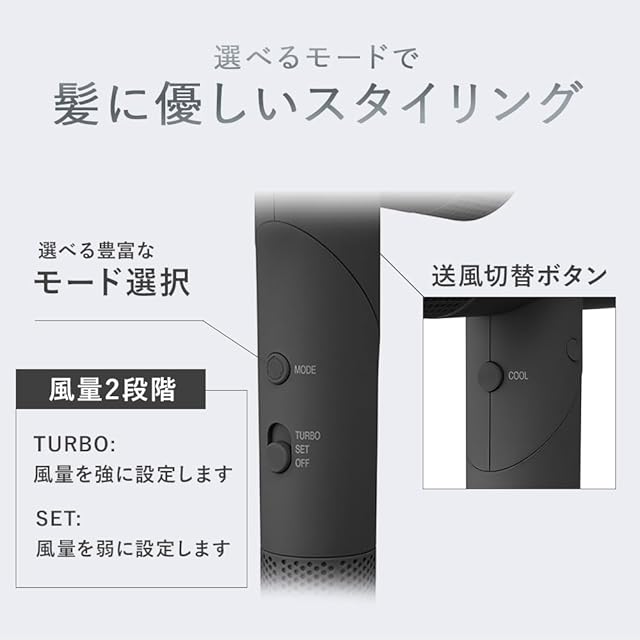【風量2段階設定】風量がTURBO/SETの2段階の調節が可能。TURBOでは風量を強く、SETでは風量を弱く設定できます。【4段階温度調節】HOT/SCALP/STYLING/COOL/の4段階の温度調節。高温風で髪と地肌を素早く乾かしたいときはHOT、低音風で地肌をいたわりながら優しく乾かしたいときはSCALP、キューティクルを引き締めくせづけなどの仕上げをしたいときにはCOOLの使用がおすすめです。温風と冷風が自動で交互に切り替わるSTYLINGモードは、温風で髪を温めてうねりやクセをとり、冷風で冷やすことでスタイリングをしっかりキープします。髪の目的に合わせてモードをボタン1つで切り替えて使うことができます。