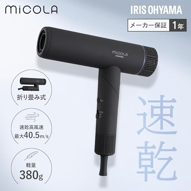 商品名:【MiCOLA】アイリスオーヤマ イオンドライヤー メーカー最速乾燥 折り畳み式 軽量 380g コンパクト パワフル ドライヤー 風量3段階 温度4段階 マイナスイオン HDR-M401-H ダークグレー