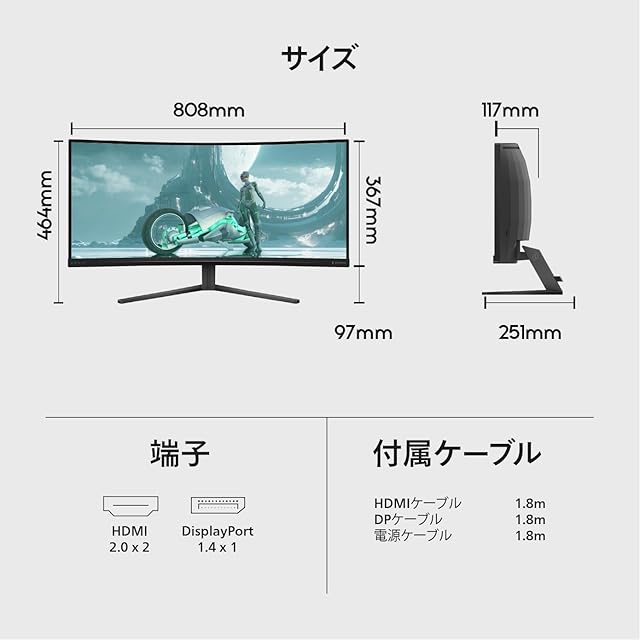 【付属品とケーブル】 DisplayPortケーブル(1.8m)、HDMIケーブル(1.8m)、電源ケーブル(1.8m)、クイックスタートガイド、書、ケーブル付属リスト、ベーススタンド、ベース支柱、VESAカバー。【本体サイズ(スタンドあり)(mm)】 808(W) × 464(H) × 251 (D)、7.33kg。【安心サポート】 お買い上げより5年間無償修理(詳細は製品画像をチェック!)。