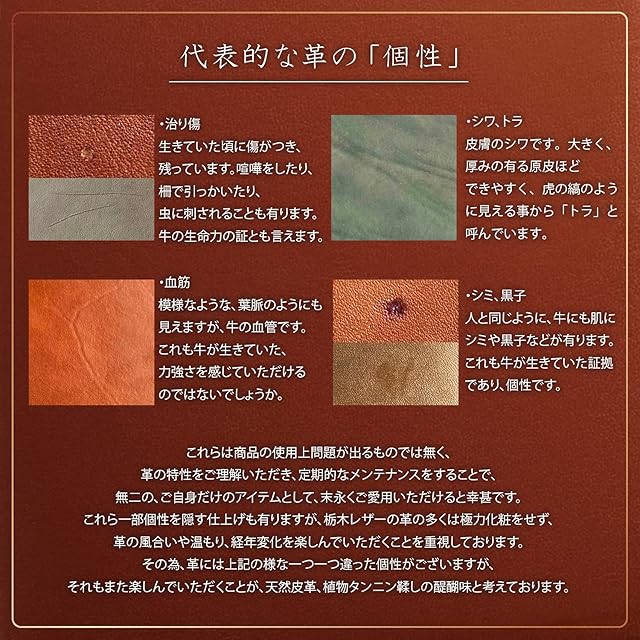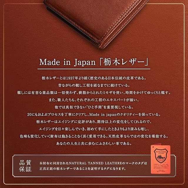 【日本製-栃木レザー】1937年より続く歴史のある日本伝統の皮革で、鞣しには有害な薬品類を一切使わず、樹脂からとれたミモザを使い、時間をかけてゆっくりと鞣しています。