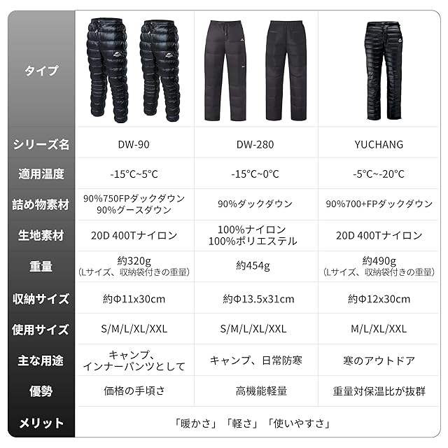 【高級ダウン・快適な温度を約束】Naturehike ダウンパンツは90%高級羽毛で、臭いや不純物はありません。軽くて柔らかいだけではなく、750FP(保温指数)なので保温性に優れています。表地は厳密な20D 400Tナイロンを採用、防水機能を持ち、良い耐久性があり、羽毛の漏れを防止することもできます。それに、上等な材質なので肌触りも優しいです。