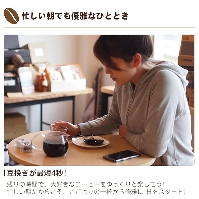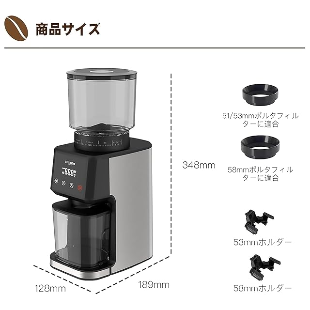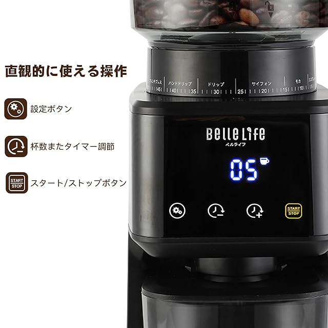 商品名:BelleLife 電動コーヒーミル コーヒーグラインダー コーン式コーヒーグラインダー 極細~粗挽き 粒度51段階設定 コーヒー粉砕機 小型 珈琲ミル 静電気飛散防止 液晶タッチパネル 大容量 豆挽き 粉末 取り外し可能 掃除ブラシ付 BD-CG018