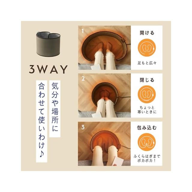 【気分や場所に合わせて使い分け♪3WAY】内蔵マグネットで簡単に開閉&使い分け。1:開ける/足元広々で席を立つ時も邪魔になりにくい。2:閉じる/ちょっと寒い時は熱を閉じ込めて両足をあたため。3:足をそれぞれ包み込んで閉じる/少ない電力でも素早くふくらはぎまでポカポカに!【「ぐるっと」だから省エネ!】電気代は1時間たったの約2.1円。寒いけどエアコンをつけるほどでもない…なんてときにもピッタリ。(※20℃の環境のもと「弱」モードで1時間使用した時の電気代の目安。電力目安料金は、全国家庭電気製品公正取引協議会電力料金目安単価31円/kWh(税込)[令和4年7月改定]で算出。電気代は、お客様と電気会社との契約内容や、使用状況[運転モード]により変動します。)