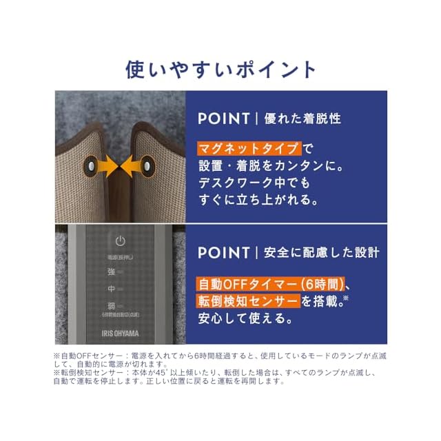 【安全に配慮した設計】[自動OFFタイマー:電源を入れて4時間経過すると、使用中モードのランプが点滅して、自動的に電源OFF。][転倒防止センサー:本体が45°以上傾いたり転倒した場合、すべてのランプが点滅して自動で運転を停止。正しい位置に戻ると運転を再開。]