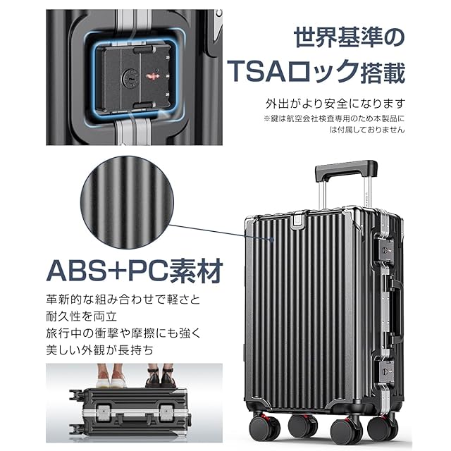 【便利なTSAロック・ストッパー付き】 アルミ スーツケース にはTSAロックが搭載されており、海外旅行でも安心してお使いいただけます。荷物をしっかりと保護し、セキュリティチェック時にもスムーズに対応できます。さらに、ストッパー付きのデザインで、使用しない際の安定性も抜群です。