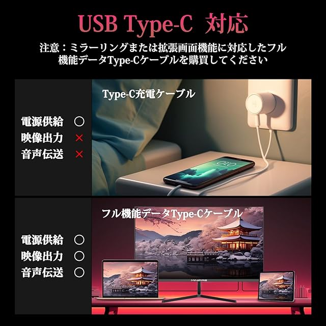 【マルチデバイス接続】豊富な入力端子:HDMI 2.0、DisplayPort 1.4、USB Type-C(映像伝送対応)を装備。PC・ゲーム機・ノートパソコンを柔軟に接続。[出力端子] 音声出力 内蔵スピーカー付き:オーディオ出力端子と2Wスピーカーでシンプルなオーディオ環境を構築 [付属品の充実] HDMIケーブル・スタンド・電源アダプターを標準同梱し、日本市場向け日本語説明書もある。モニターのType‑C端子では給電・充電ができません。