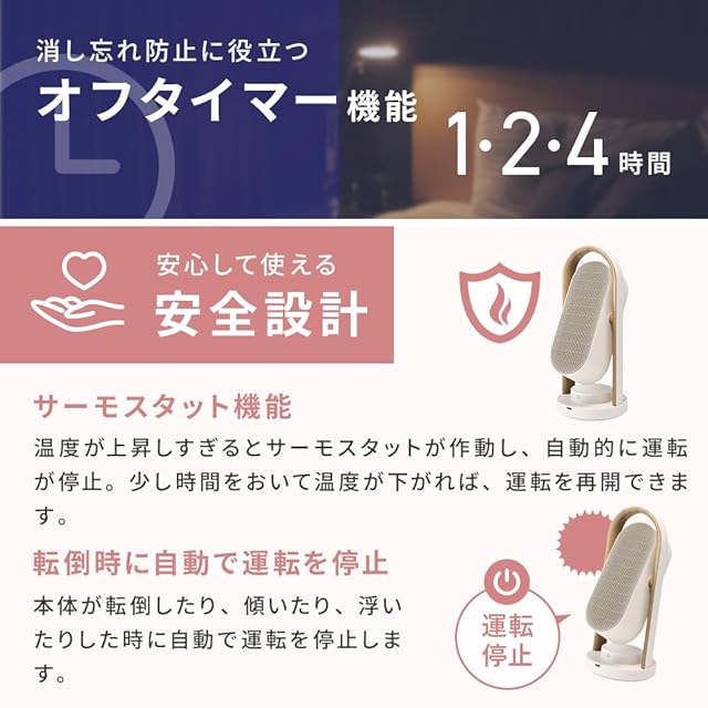 オフタイマー設定か可能(1・2・4時間)就寝前など設定できる便利な機能付き。安全装置も搭載しており、温度ヒューズ、サーモスタット、転倒時自動オフスイッチと安心してご使用いただけます。