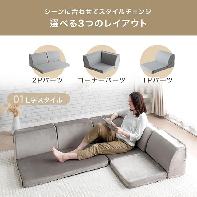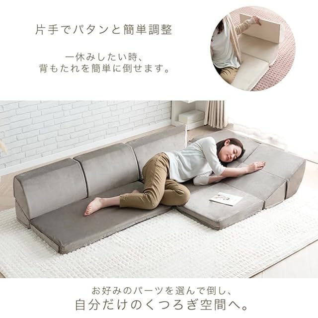 【スタッフのおすすめポイント!】<br> ・背もたれが倒れるのでスタイルに合わせて自由に変形可能<br> ・圧迫感のなくお部屋を広く見せるロータイプ<br> ・2セット組み合わせてコの字に配置すれば大人数で寛げる<br> ・裏面はズレ防止テープでしっかり固定
