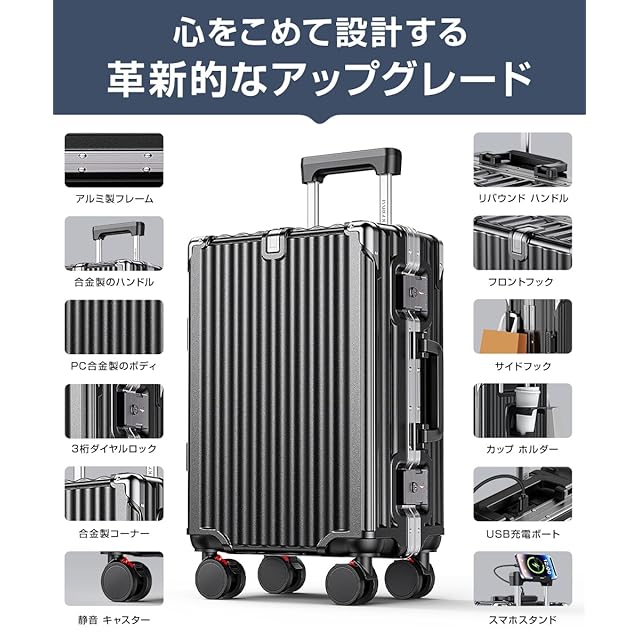 【高機能なスーツケース】このスーツケースは、旅行やビジネス出張に最適な設計が施されています。耐衝撃性に優れたアルミフレームを採用しており、移動中の衝撃から大切な荷物を守ります。大容量でありながら軽量なデザインにより、持ち運びが楽で、荷物をたくさん詰め込んでも負担になりません。