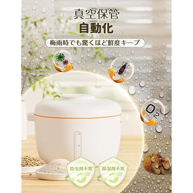 【真空保存の秘密は】気圧センサー内蔵で、容器内の空気圧が-15Kpaを超えると(この大気圧では、バクテリアや虫はまだ生き残れません)、気圧を自動で調整して-20Kpaに維持します。真空米びつと食品が空気と触れにくくなり、酸化のスピードを遅らせられます。