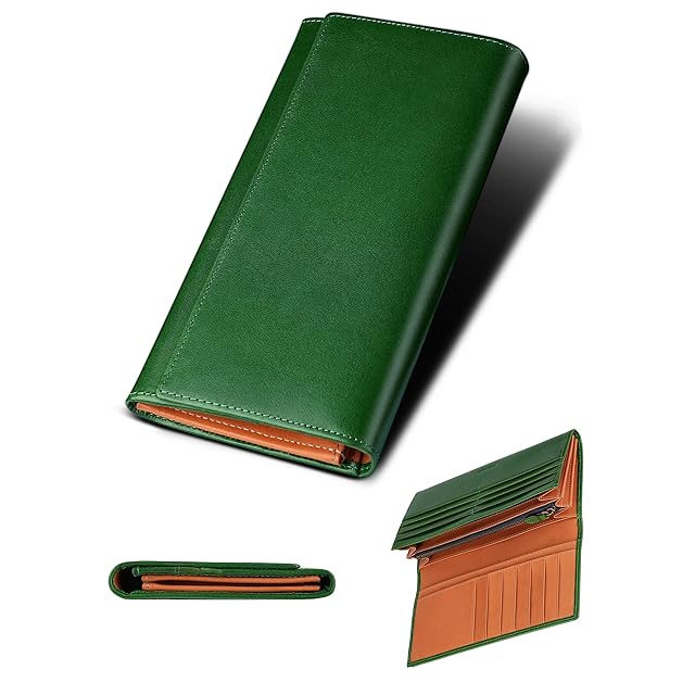 [ファブリツィオ] 財布 メンズ レディース 長財布 2つ折り マチ付き 小銭入れ 薄い 大容量 カード21枚 使いやすい イタリアン レザー 一流の革職人が作る 本革 YKKファスナー(グリーン)