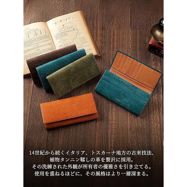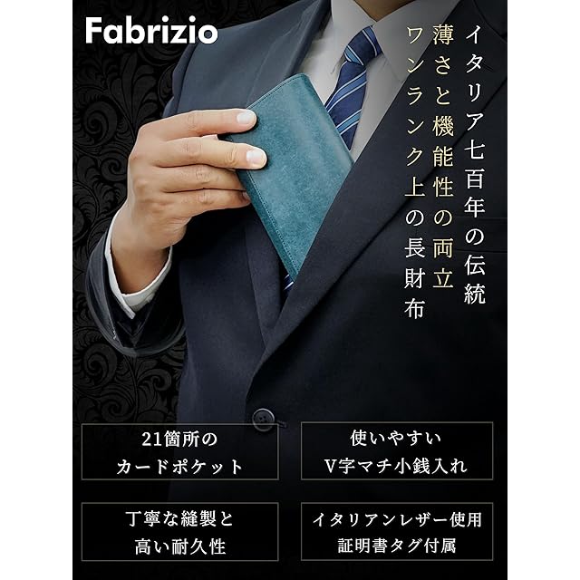 商品名:[ファブリツィオ] 財布 メンズ レディース 長財布 2つ折り マチ付き 小銭入れ 薄い 大容量 カード21枚 使いやすい イタリアン レザー 一流の革職人が作る 本革 YKKファスナー (ペトローリオ)