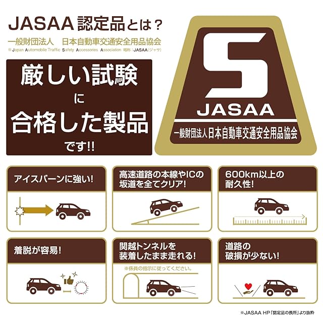【安心してご使用いただける理由その3】スパイクピンを超硬材質&マカロニ型にすることで、アイスバーンへの食い付きを飛躍的に向上させました。アイスバーンへの性能は、降雪翌日の都市部でも威力を発揮します。・丈夫で長持ちの高性能ポリウレタンエラストマーを採用。耐久性 jasaa基準の1.5倍(自社基準)
