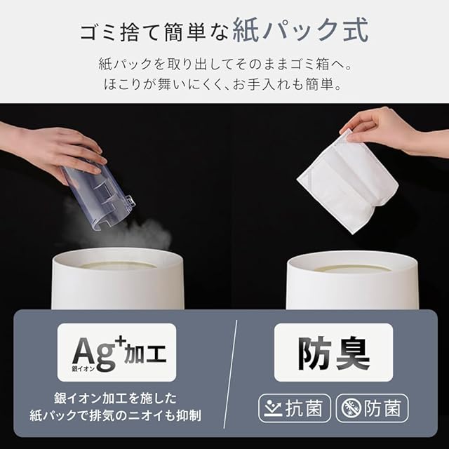 ゴミ捨て簡単紙パック式。紙パックを取り出してそのままごみ箱へ。ほこりも舞いづらく、お手入れも簡単です。