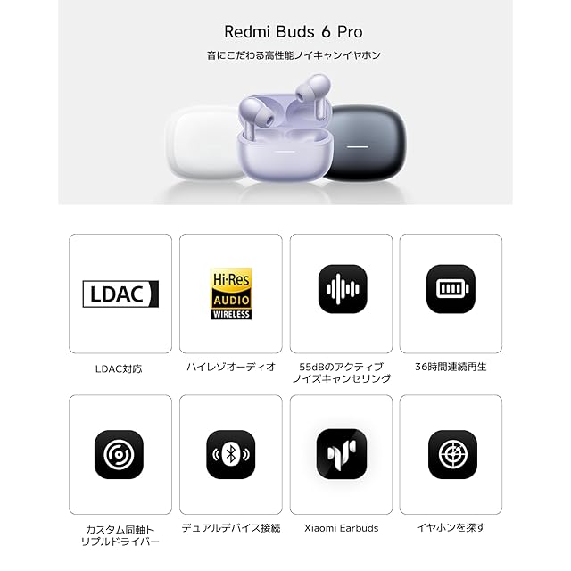 商品名:シャオミ(Xiaomi) ワイヤレスイヤホン Redmi Buds 6 Pro 55dBまでアクティブノイズキャンセリング Bluetooth 5.3 進化したトリプルドライバー LDAC対応 ハイレゾオーディオワイヤレス 最大36時間音楽再生 Google Fast Pair スペースブラック