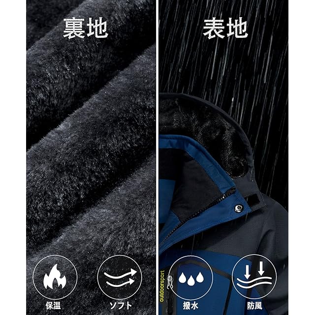【多機能】1、撥水加工/防汚性/防風性:①防風、防水、防污のある機能性生地を採用します。②ファスナーは防水層デザインを付いて、防水性能を高めます。③ジャケットの継手の所に防水工芸を採用します。 2.防寒性/保温性:裏は裏起毛のデザインです。帽子と袖口の設計も保温性を強めます。 3.通気性/透湿性。