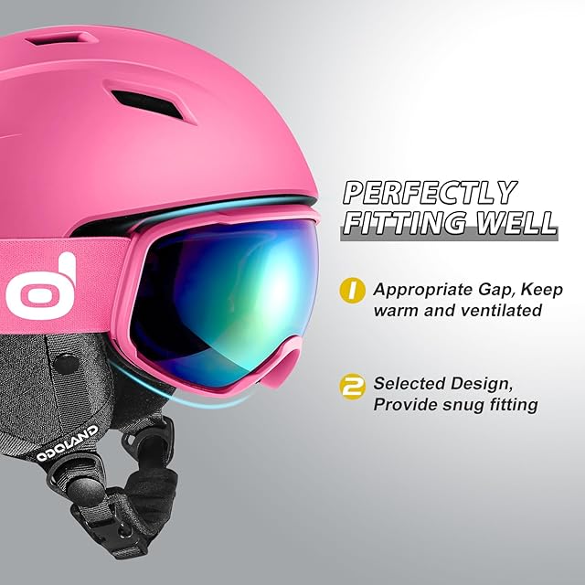 Odoland スキーヘルメットセット ゴーグル付き スノーボードヘルメット ダイヤル式サイズ調整 メガネ対応 ダブル球面レンズ 防風 曇り止め 耐衝撃 UVカット 男女兼用 大人・ジュニア・子供用 ピンク M