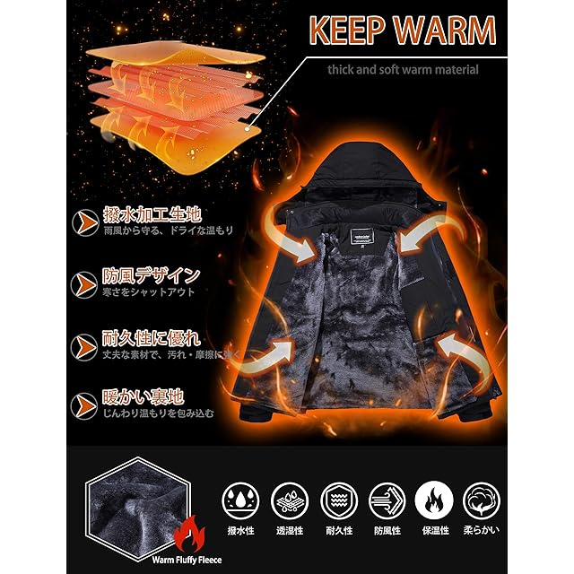 表地は撥水加工を施したマウンテンパーカーは裏ボア付きなので、着た瞬間から温もりを与えてくれます、防寒性と保温性に抜群、それだけでなく、防風性、防汚性、ある程度の防水性も備えており、冬のキャンプ、外出、作業、スキーなどに適しています。冬の必需品の防寒アウターです。