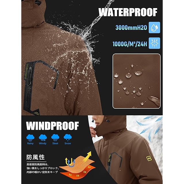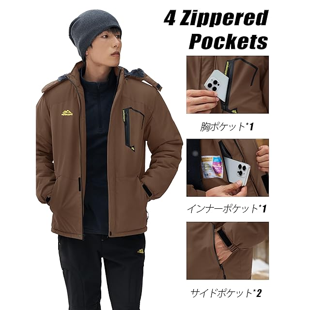 [KEFITEVD] バイクジャケット メンズ 冬用 マウンテンパーカー 防風 アウトドアウェア 暖かい 裏起毛 登山 釣り 作業着 防寒着 茶色 JP 4XL