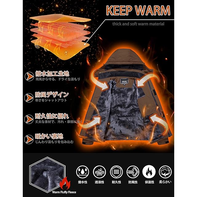 表地は撥水加工を施したマウンテンパーカーは裏ボア付きなので、着た瞬間から温もりを与えてくれます、防寒性と保温性に抜群、それだけでなく、防風性、防汚性、ある程度の防水性も備えており、冬のキャンプ、外出、作業、スキーなどに適しています。冬の必需品の防寒アウターです。