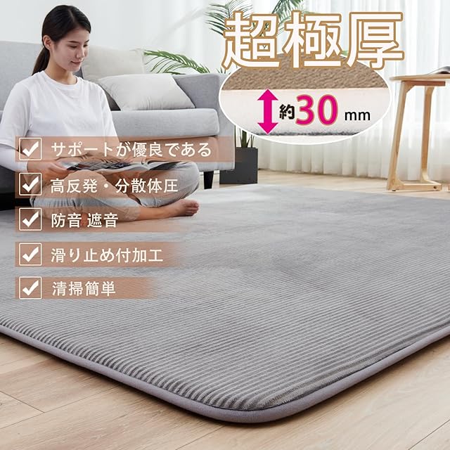 商品名:カーペットラグ 極厚 ラグマット 1.5畳 高反発 130×185 cm 厚手30 mm 冬 床暖房対応 カーペット 洗える 滑り止め付 じゅうたん 防ダニ 抗菌 オールシーズン フランネル グレー aicomri