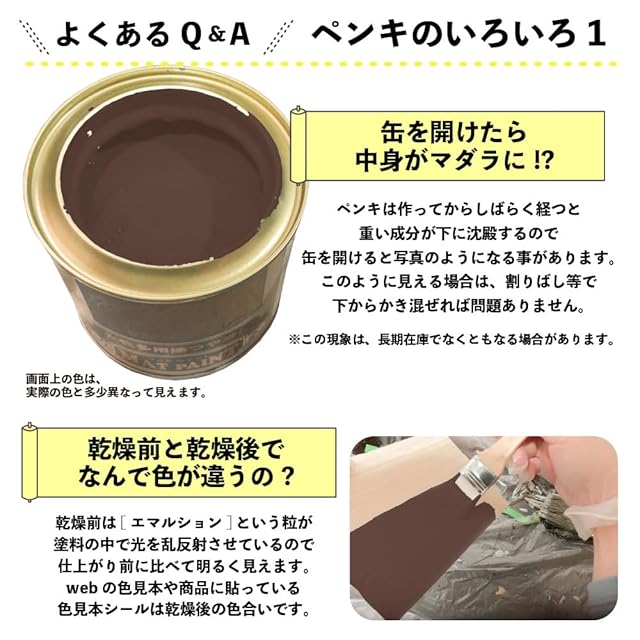 【塗装時の注意・救急処置】※取扱いの際は、商品記載の注意事項等をよく読んでからご使用ください。 ■[乾燥時間・塗面積について]乾燥時間、塗面積の表示は、気象条件・塗る素材・形状・塗り方などによって多少異なります。 ■[塗装時は広がり易いので要注意]人・物・観賞魚・ペット類・食品等にかからないようにして下さい。 ■[寒期・梅雨時期は注意を]気温5℃以下の時や、雨天・湿度の高い時(101%以上)及び風の強い時は、塗らないで下さい。 ■[汚れてもいい服装で]汚れても差し支えのない服装で作業してください。