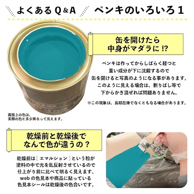 【塗装時の注意・救急処置】※取扱いの際は、商品記載の注意事項等をよく読んでからご使用ください。 ■[乾燥時間・塗面積について]乾燥時間、塗面積の表示は、気象条件・塗る素材・形状・塗り方などによって多少異なります。 ■[塗装時は広がり易いので要注意]人・物・観賞魚・ペット類・食品等にかからないようにして下さい。 ■[寒期・梅雨時期は注意を]気温5℃以下の時や、雨天・湿度の高い時(99%以上)及び風の強い時は、塗らないで下さい。 ■[汚れてもいい服装で]汚れても差し支えのない服装で作業してください。