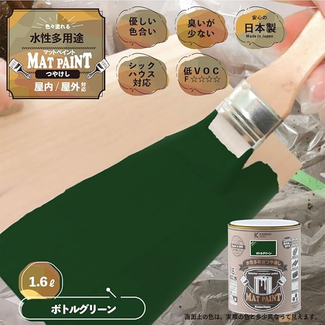 商品名:カンペハピオ ペンキ 塗料 水性 つやけし 多用途 マットペイント ボトルグリーン 1.6L 日本製 00347651671016