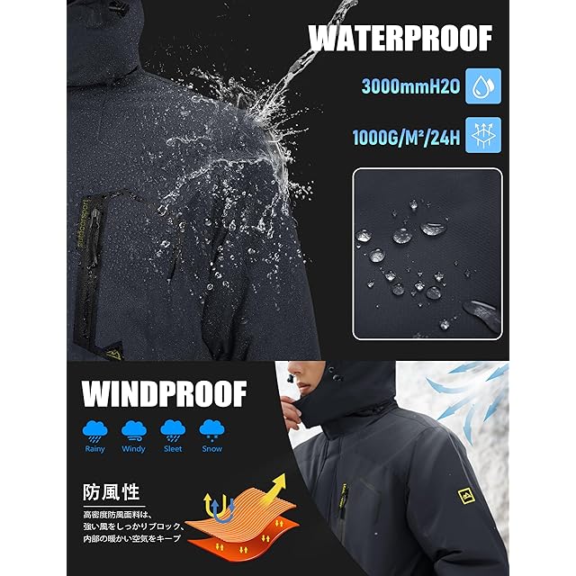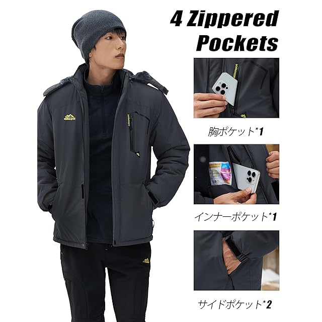 表地は撥水加工を施したマウンテンパーカーは裏ボア付きなので、着た瞬間から温もりを与えてくれます、防寒性と保温性に抜群、それだけでなく、防風性、防汚性、ある程度の防水性も備えており、冬のキャンプ、外出、作業、スキーなどに適しています。冬の必需品の防寒アウターです。