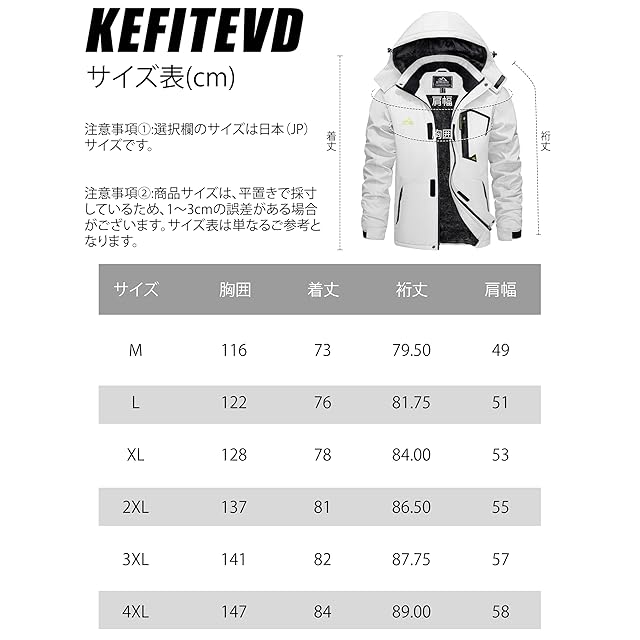商品名:[KEFITEVD] アウター メンズ 冬 スキージャケット 裏ボア ジャンパー 防風 ウィンドブレーカー 撥水 マウンテンパーカー 防寒ジャケット スノーボードウエア 白 ホワイト JP XL