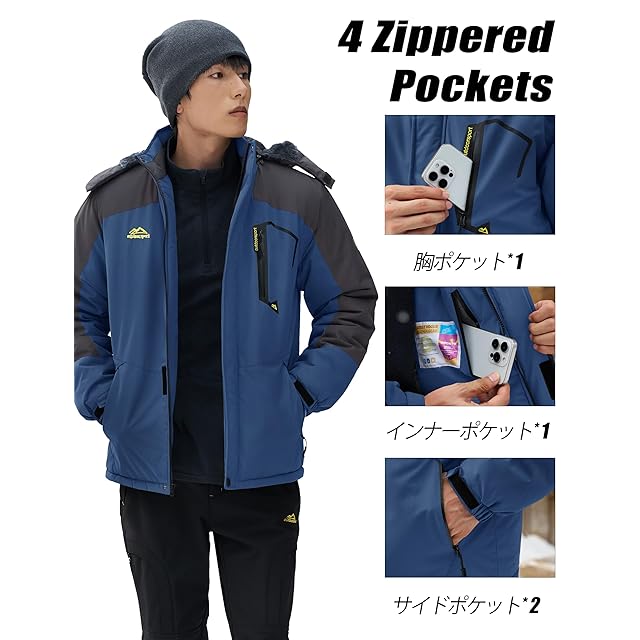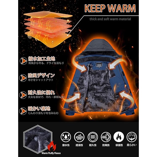 表地は撥水加工を施したマウンテンパーカーは裏ボア付きなので、着た瞬間から温もりを与えてくれます、防寒性と保温性に抜群、それだけでなく、防風性、防汚性、ある程度の防水性も備えており、冬のキャンプ、外出、作業、スキーなどに適しています。冬の必需品の防寒アウターです。