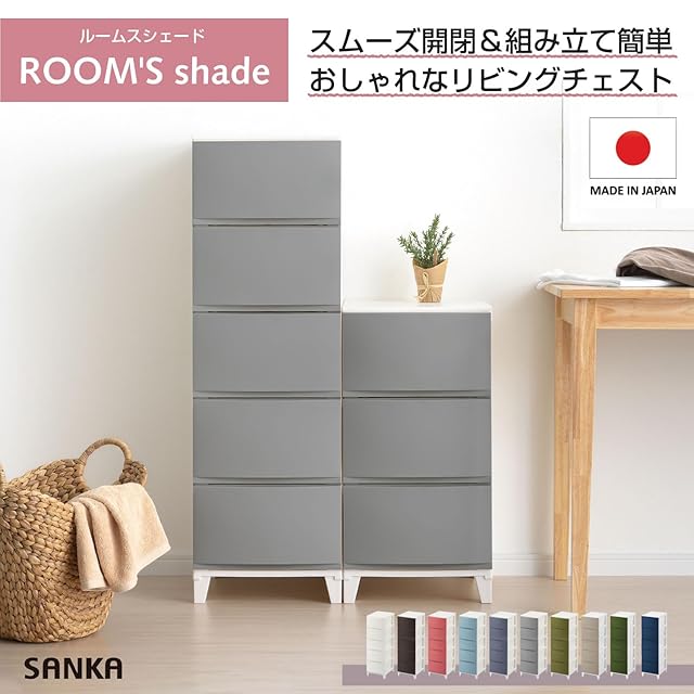 サンカ ルームス 収納 チェスト サンドグレー スリム 5段 (幅34×奥行42×高さ107cm) スルっと引き出せて スキッと締まる引き出し キズ付きにくいマット加工パネル 簡単組み立て おしゃれ 収納ケース 収納ボックス 日本製 衣装ケース タンス リビング クローゼット 洗面所ROOM'S shade RSD-S345SGY