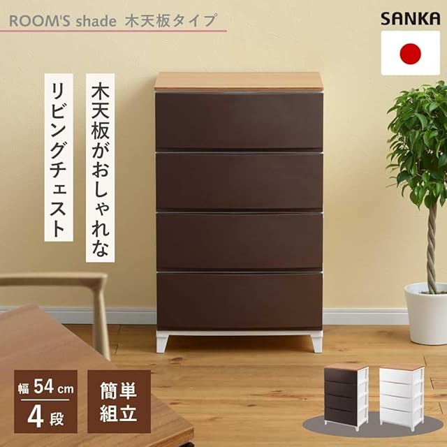 サンカ ルームス 木天板 収納 チェスト ブラウン ワイド 4段 (幅54×奥行42×高さ88cm) スルっと引き出せて スキッと締まる引き出し キズ付きにくいマット加工パネル 簡単組み立て 日本製 衣装ケース タンス ROOM'S shade squ+ RSDM-S544BR