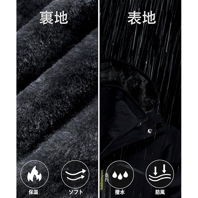 【多機能】1、撥水加工/防汚性/防風性:①防風、防水、防污のある機能性生地を採用します。②ファスナーは防水層デザインを付いて、防水性能を高めます。③ジャケットの継手の所に防水工芸を採用します。 2.防寒性/保温性:裏は裏起毛のデザインです。帽子と袖口の設計も保温性を強めます。 3.通気性/透湿性。
