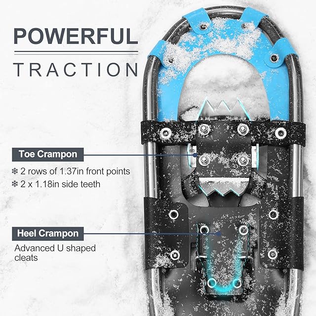 【男女兼用4-in-1セット】このセットには、2*スノーシューズ、1*トレッキングポール、1*スノーゲイター、および1*収納袋が含まれています。使いやすさをする軽量で高品質の素材で作られ、便利なバッグが付けているこのセットは、スノーシューイングの冒険やアウトドア活動に最適です。 80-120lbs / 35-55kgで21インチ、120-160lbs / 55-73kgで25インチ、160-250lbs / 73-113kgで30インチ。