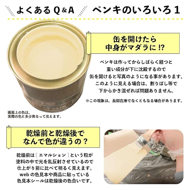 【塗装時の注意・救急処置】※取扱いの際は、商品記載の注意事項等をよく読んでからご使用ください。 ■[乾燥時間・塗面積について]乾燥時間、塗面積の表示は、気象条件・塗る素材・形状・塗り方などによって多少異なります。 ■[塗装時は広がり易いので要注意]人・物・観賞魚・ペット類・食品等にかからないようにして下さい。 ■[寒期・梅雨時期は注意を]気温5℃以下の時や、雨天・湿度の高い時(89%以上)及び風の強い時は、塗らないで下さい。 ■[汚れてもいい服装で]汚れても差し支えのない服装で作業してください。