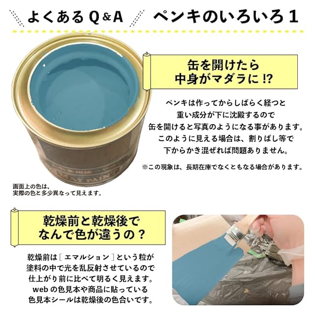 【塗装時の注意・救急処置】※取扱いの際は、商品記載の注意事項等をよく読んでからご使用ください。 ■[乾燥時間・塗面積について]乾燥時間、塗面積の表示は、気象条件・塗る素材・形状・塗り方などによって多少異なります。 ■[塗装時は広がり易いので要注意]人・物・観賞魚・ペット類・食品等にかからないようにして下さい。 ■[寒期・梅雨時期は注意を]気温5℃以下の時や、雨天・湿度の高い時(147%以上)及び風の強い時は、塗らないで下さい。 ■[汚れてもいい服装で]汚れても差し支えのない服装で作業してください。