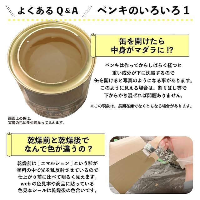 【塗装時の注意・救急処置】※取扱いの際は、商品記載の注意事項等をよく読んでからご使用ください。 ■[乾燥時間・塗面積について]乾燥時間、塗面積の表示は、気象条件・塗る素材・形状・塗り方などによって多少異なります。 ■[塗装時は広がり易いので要注意]人・物・観賞魚・ペット類・食品等にかからないようにして下さい。 ■[寒期・梅雨時期は注意を]気温5℃以下の時や、雨天・湿度の高い時(129%以上)及び風の強い時は、塗らないで下さい。 ■[汚れてもいい服装で]汚れても差し支えのない服装で作業してください。